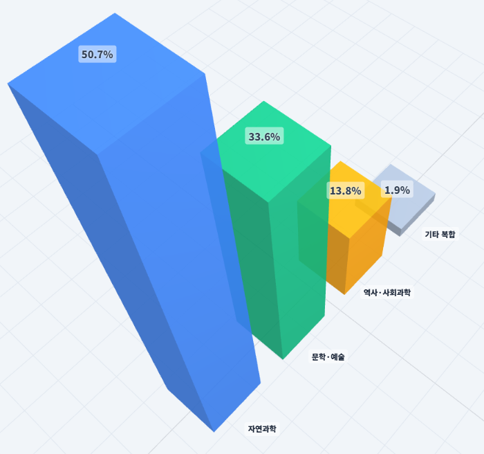 College Board 공식 기준에 따라 분석한 결과, 디지털 SAT의 핵심 동력은 단연 '과학'입니다. 자연과학 주제는 1,177문제 중 597개로 전체의 50.7%를 차지할 만큼 비중이 높습니다.주로 실험 설계의 논리를 따라가거나 데이터에서 결론을 도출하는 능력을 요구하는 것이 특징입니다.