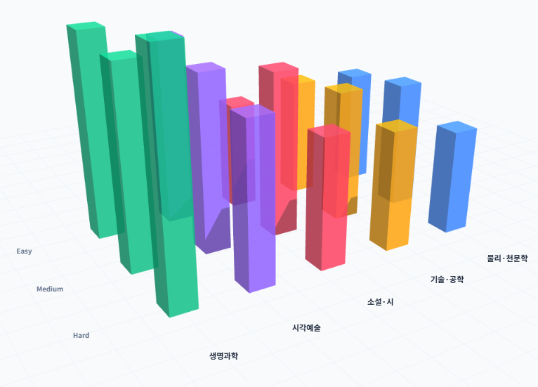점수 정체기 탈출의 열쇠는 '어려운 문제'의 구성을 이해하는 데 있습니다. 데이터를 분석해 본 결과, 생명과학 지문은 난이도가 올라갈수록 출제 비중이 더 높아집니다(Hard 난이도에서 20.3%).즉, 상위권으로 도약하기 위해서는 생명과학 지문의 복잡한 실험 논리를 완벽히 파악하는 것이 필수입니다.