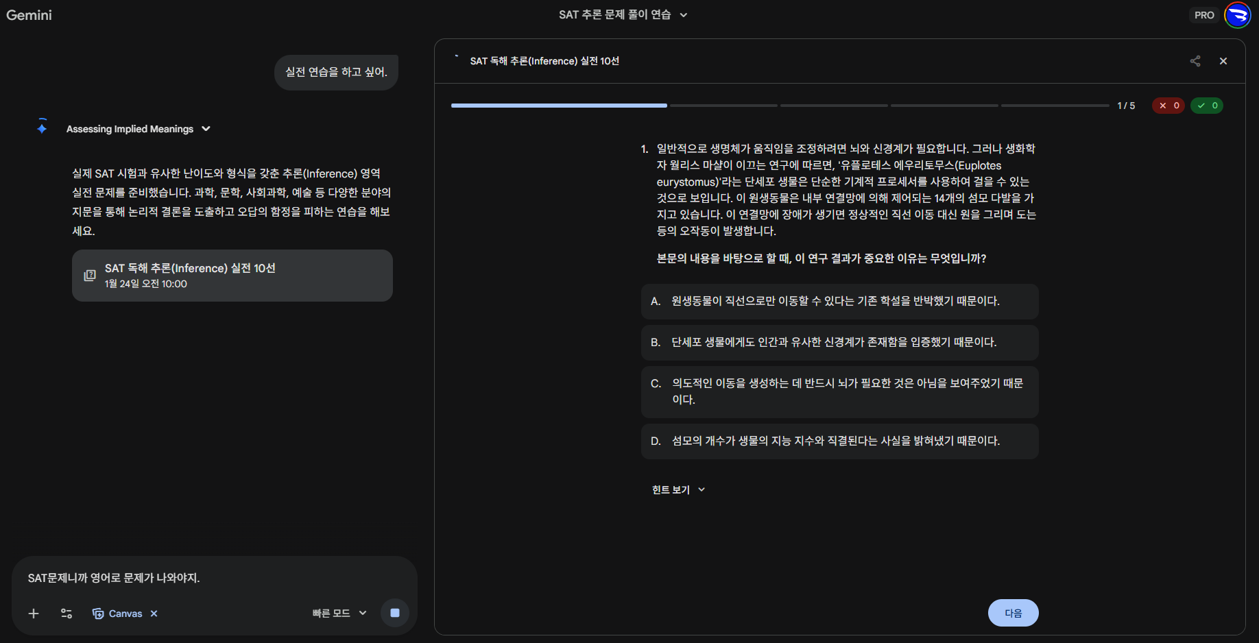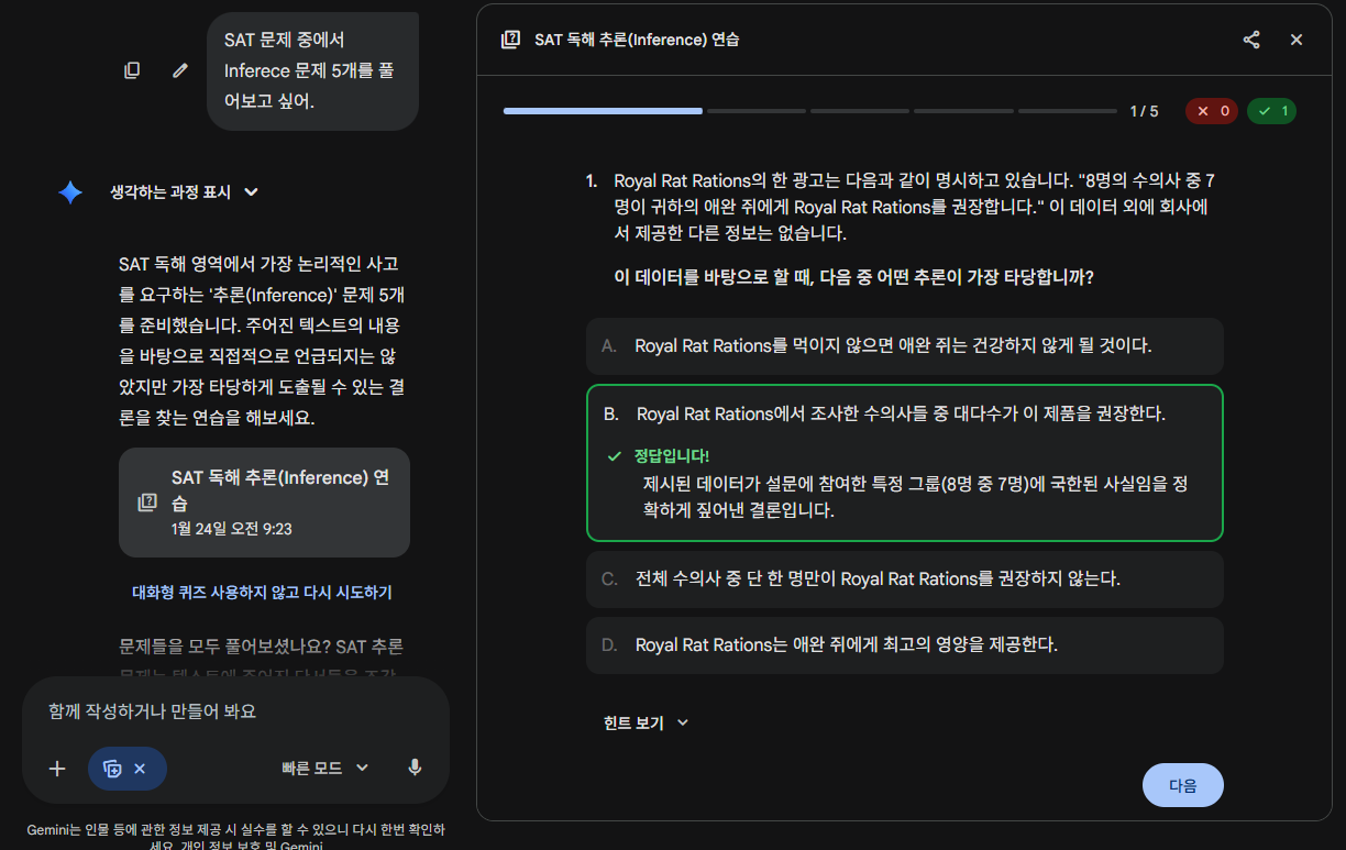 - Gemini 안에서 프린스턴 리뷰 기반의 SAT 문제를 풀어볼 수 있습니다.