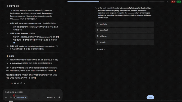 - 문제를 풀면서 Gemini에게 질문을 할 수 있습니다. chatGPT, NotebookLM으로 공부하는 것과 차이는 없지만, 콘텐츠와 LLM이 붙어있는 것 자체로 향상되는 쾌적함이 있습니다.