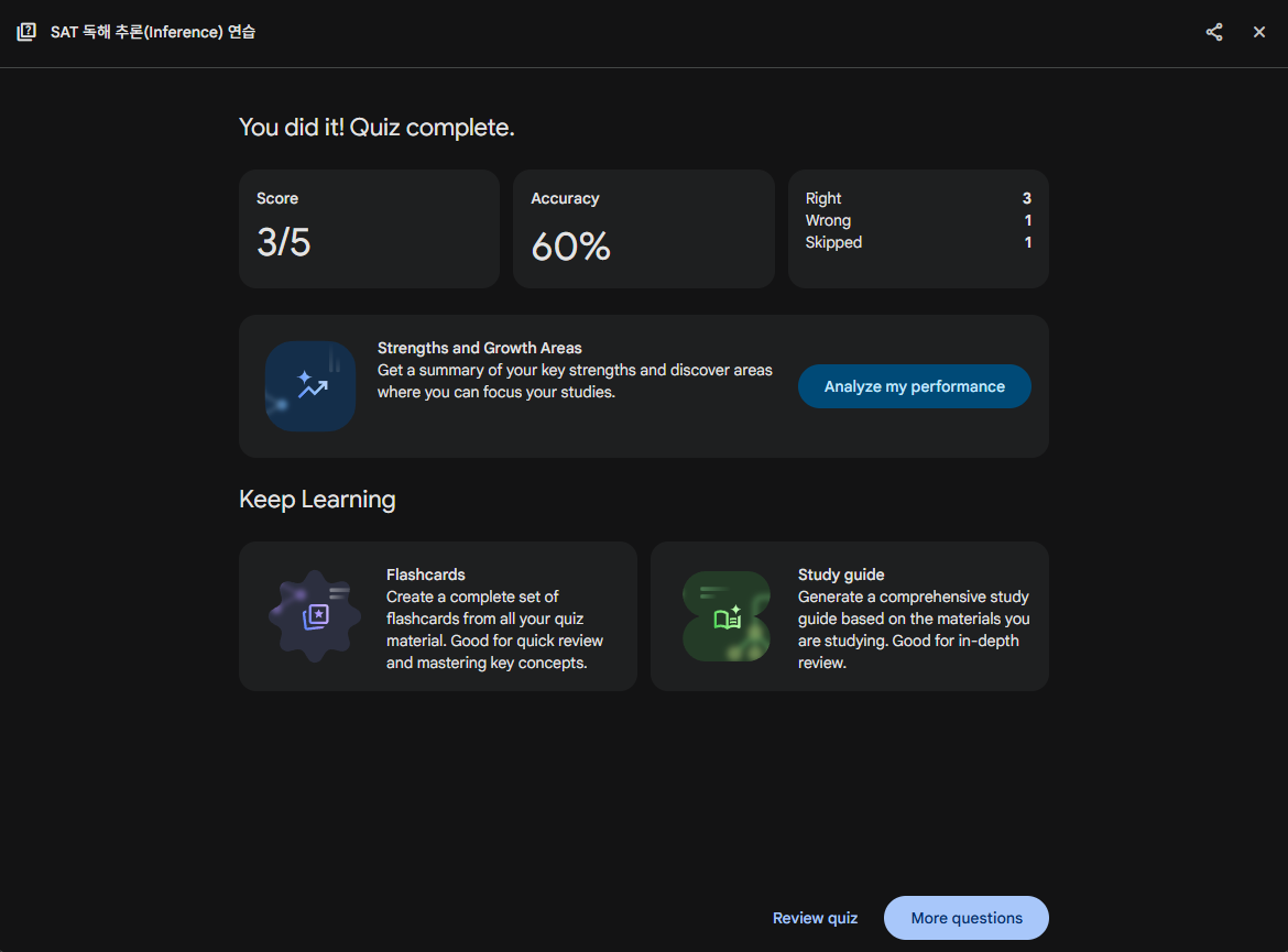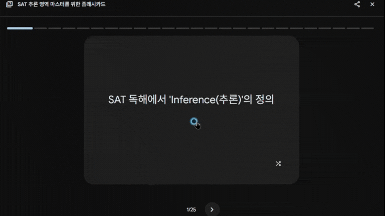 큰 틀에서 현재 저희가 연구하고 있는 UI/UX와 유사한 접근을 하고 있는 부분은 문제를 다 풀고 나면 "Flashcards" 기능이었습니다. 저는 테스트로 Inference 문제 5개를 풀어보고 싶다고 하고 문제를 풀어보았습니다. 문제를 다 풀자 Inference 파트에 대한 개념 설명을 플래시카드 형태로 공부할 수 있었습니다.