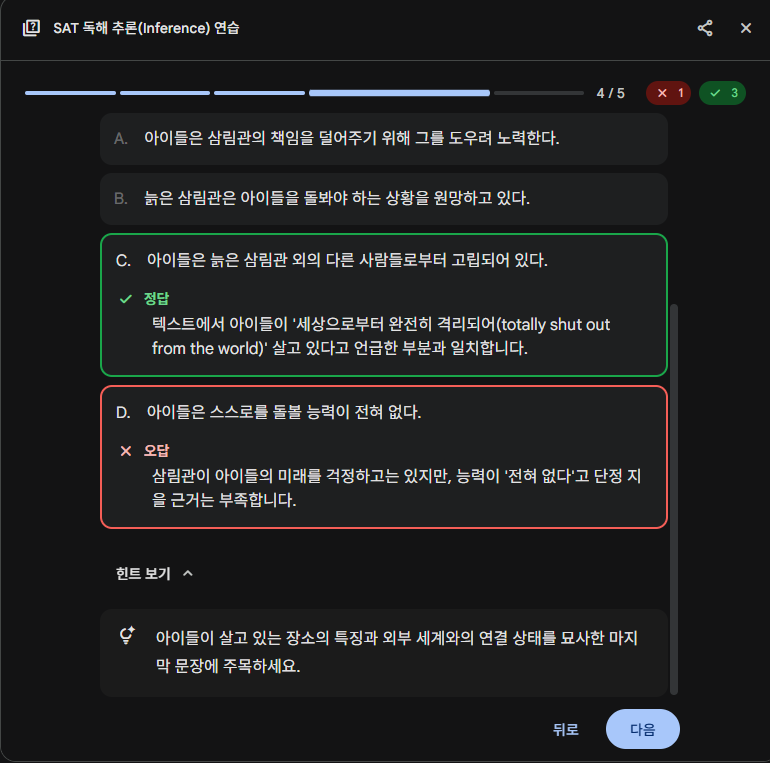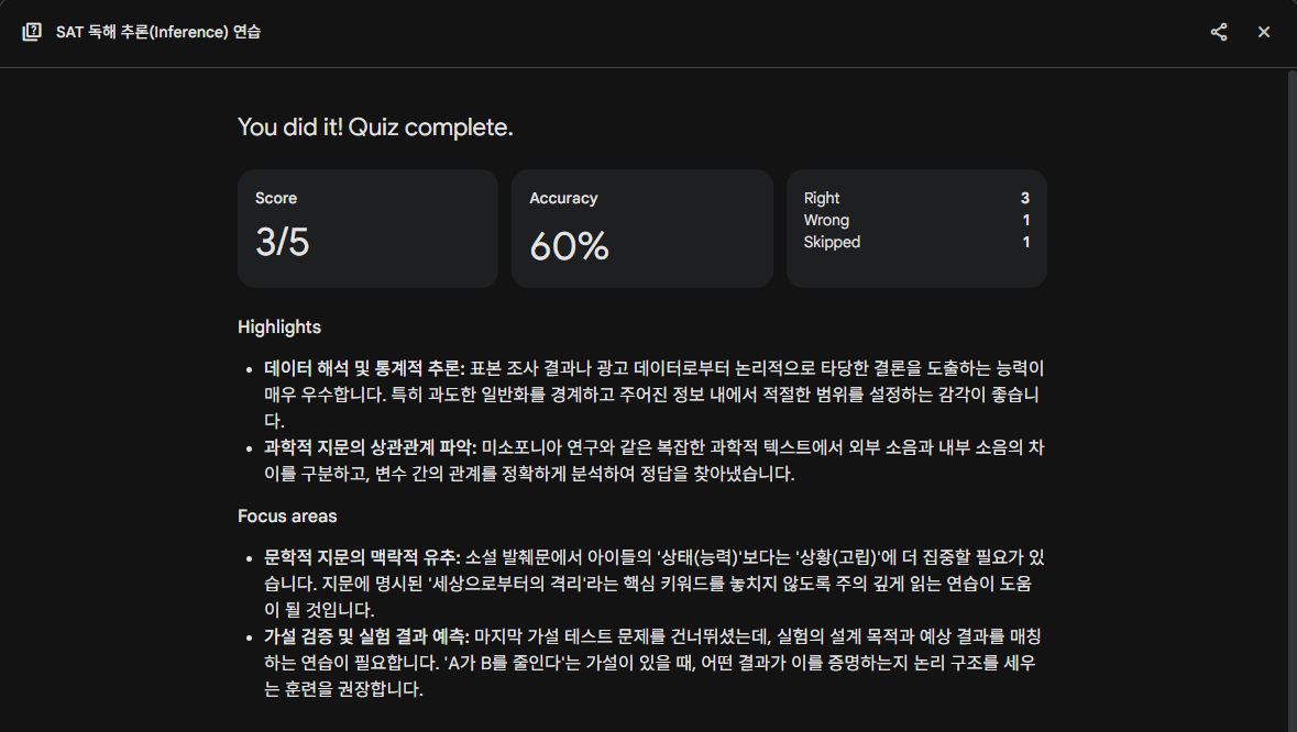 큰 틀에서 보면, gemini를 통해 '나름' 개인화된 학습 계획을 생성해 다음 공부 방향을 잡을 수 있습니다. “문제 풀이 → 해설 이해 → 결과 분석 → 학습 계획”이 한 흐름으로 연결되는 구조로 SAT 공부를 구성할 수 있습니다.